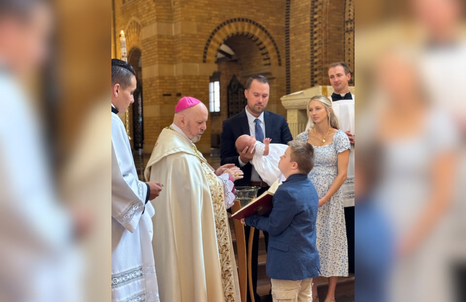 Michael Martin holds the book for Denver Archbishop Samuel J. Aquila during a family Baptism. (Photo courtesy of the Martin family)