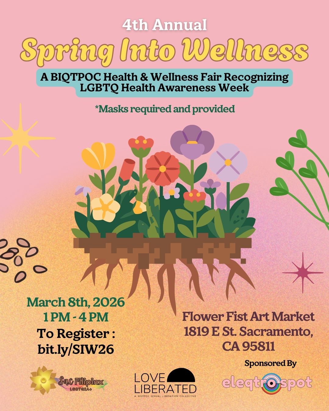 Fortify your mind and body with the 4th Annual Spring Into Wellness Health Fair, a free community event that highlights health and wellness resources, businesses, practitioners and nonprofit organizations serving Black, Indigenous, Queer and Trans People of Color (BIQTPOC) in Sacramento. Organized by Love Liberated and Sacramento Filipinx LGBTQIA+ in recognition of National LGBTQ Health Awareness Week, the fair will feature free yoga instruction and sound healing, music, food, interactive workshops, giveaways, raffles and affirming health resources.