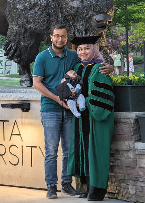 Kazi Sarjana Safain poses for a photo with her husband, Mohammad Al Mahmud Un Nabi, and son, Musahib Un Nabi, at the North Dakota State University Spring Commencement in 2025.