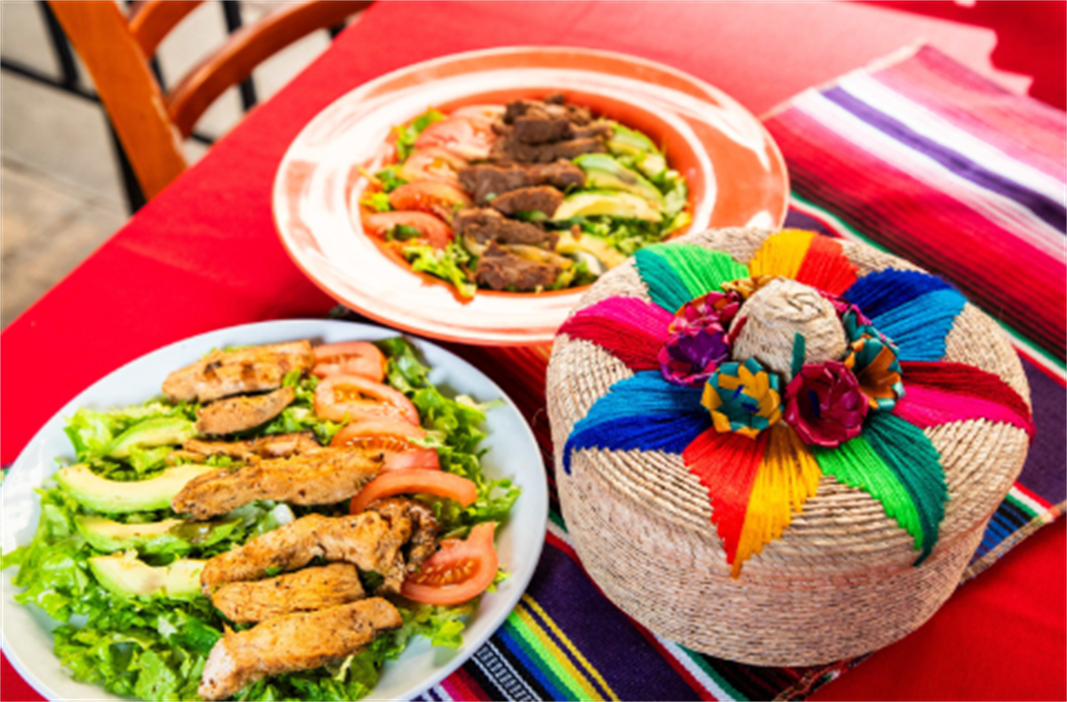Grilled chicken and steak salads with avocado and tomatoes on a red table beside a colorful woven basket.