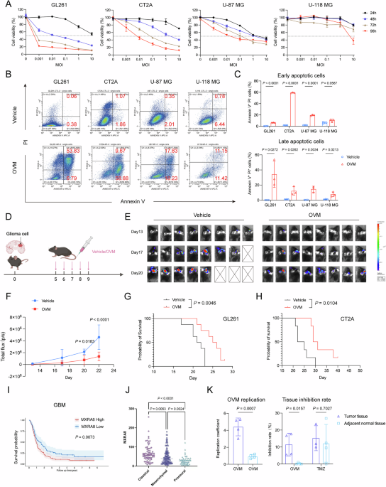 This study was approved by the Institutional Review Board of Sun Yat-Sen University Cancer Center. GBM samples were freshly acquired during surgical resection. Live tumor tissues were minced into appropriately sized microtissue fragments (approximately 1 mm³) and uniformly seeded into 24-well plates. The plates were then incubated in a CO2 incubator. After 24 h of culture, the samples were treated with OVM (150 µL, titer: 1.16 × 108 CCID50/mL), TMZ (50 mg/mL) or vehicle control for 72 h. Subsequently, MTT stock solution was added to each well at a volume equivalent to 10% of the total well volume. After 2–4 h of incubation at 37 °C, the tissue fragments were analyzed via a tissue cell image analyzer. The analyzer captured both transmitted light images of the tissue fragments and quantified the area stained with formazan blue. The rate of drug inhibition was calculated via the following formula:
