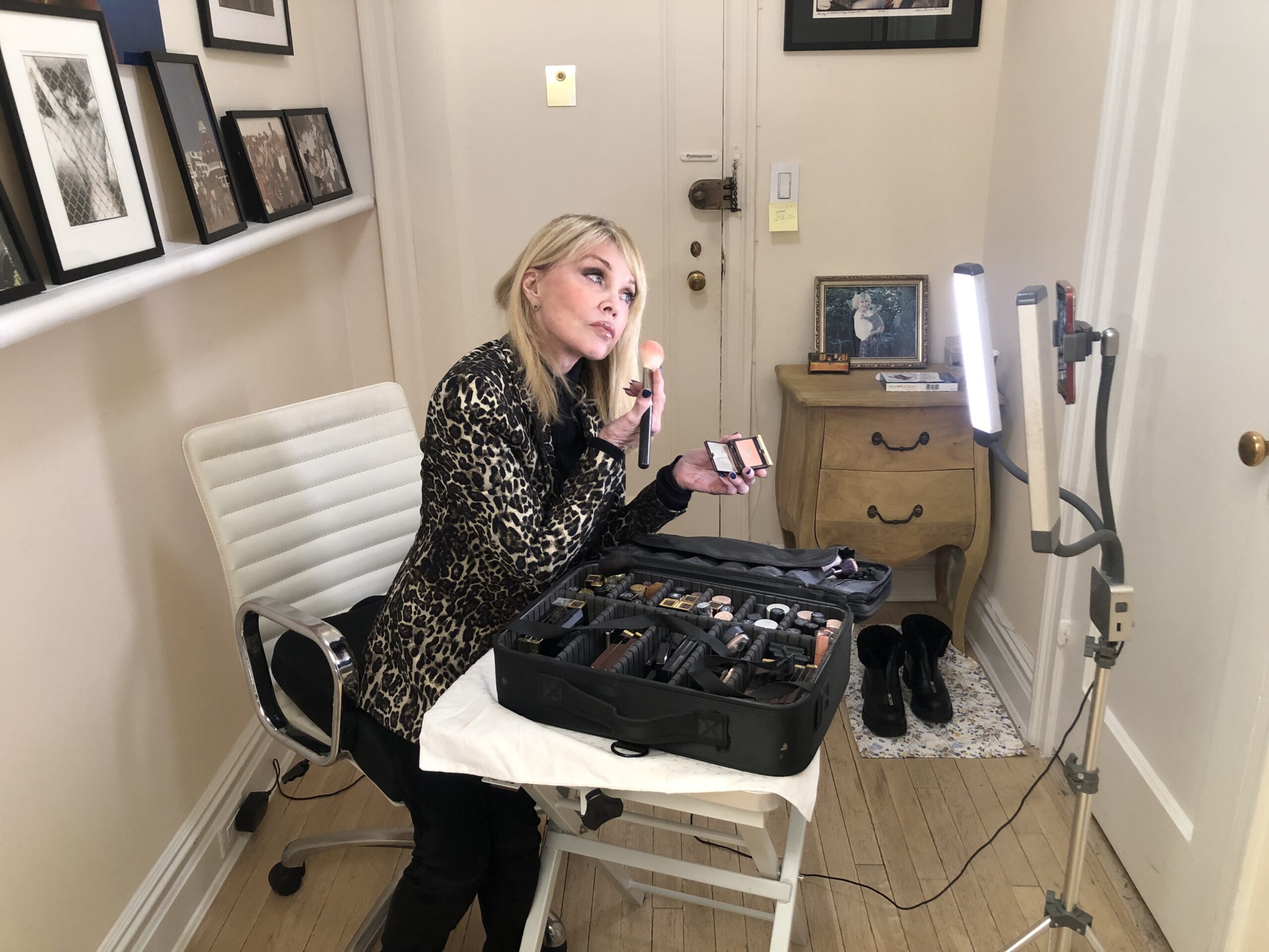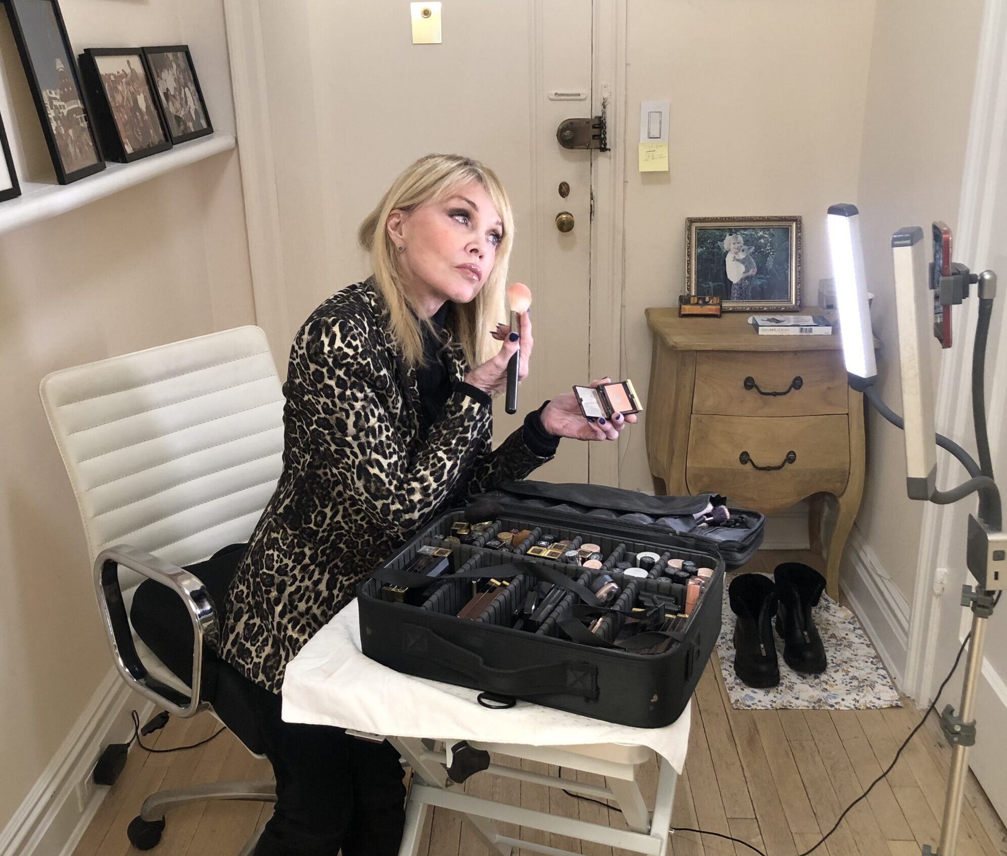 Then she sat down in my chair and she put her head back. I picked up my pencil to line her eye and she went, “Ouch.” So I looked at the pencil and I had forgotten to sharpen it, so I went back to my counter and I was shaking as I was sharpening this pencil. And when I walked back, she just had put her head back and closed her eyes, ready for me to continue. It wasn’t a big deal to her. But for me, I wanted to die. It came out beautiful. She has very large eyes, and they’re set far apart, so I took a wine-colored shadow in the hollow of her eye closer to her nose to draw her eyes a little bit closer together. She leaves and I love what I did, and I love what she allowed me to do. I told her to walk into that room so she could see herself full-length and she went, “Oh,” in that Marilyn Monroe voice. “It’s beautiful.”