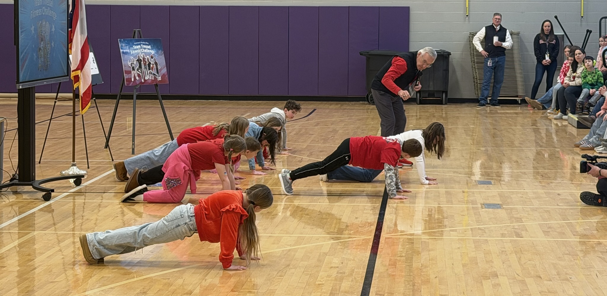 Ohio Lt. Gov. Jim Tressel entertained and inspired Berkshire Elementary School students to join his Team Tressel Fitness Challenge in the school gymnasium Feb. 13.