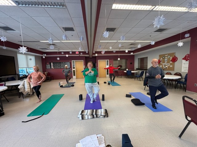Doherty’s yoga class is an “all levels practice.” It is not necessarily in a chair, unlike the Wednesday classes at the Senior Center. Participants may be standing, on their hands and knees or seated. Doherty said she was advised to avoid too many planks or heavy upper-body exercises.