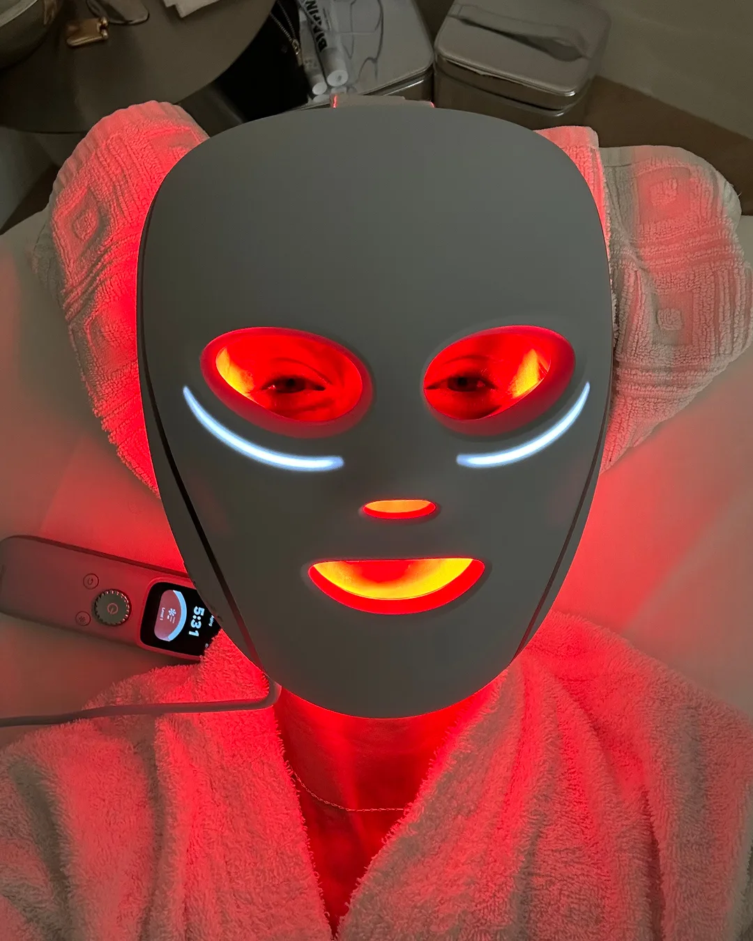 “I love the fact that it brings all my favourite tools into one,” she says. “Red light, blue light and infrared therapy with the added bonus of cryo under-eye treatment.”