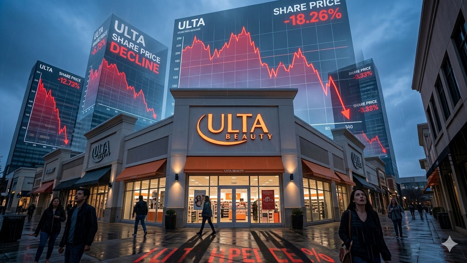 A dramatic image of an Ulta Beauty storefront with stock market charts falling in the background, symbolizing the company’s share price decline.