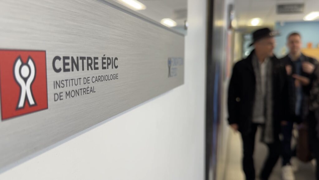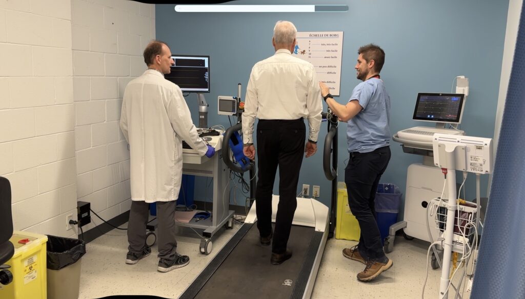Dr. Josep Iglesies-Grau (right) and a colleague (left), showing patient and study participant Claude Grillon (centre) a protocol they often use to determine a patient’s exercise tolerance as a machine monitor’s their vitals. (Corinne Boyer, CityNews)