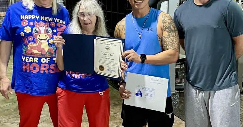 On March 10, Elmer De Jesus of Falling Waters, was presented with a Certificate of Recognition signed by West Virginia Governor Patrick Morissey for his completion of 10 years instructing dance at Extreme Family Fitness in Martinsburg. Presenting for the Governor are two of his students, Luisa and Michael Peters. At right is Chris Perkins, general manager of the gym.