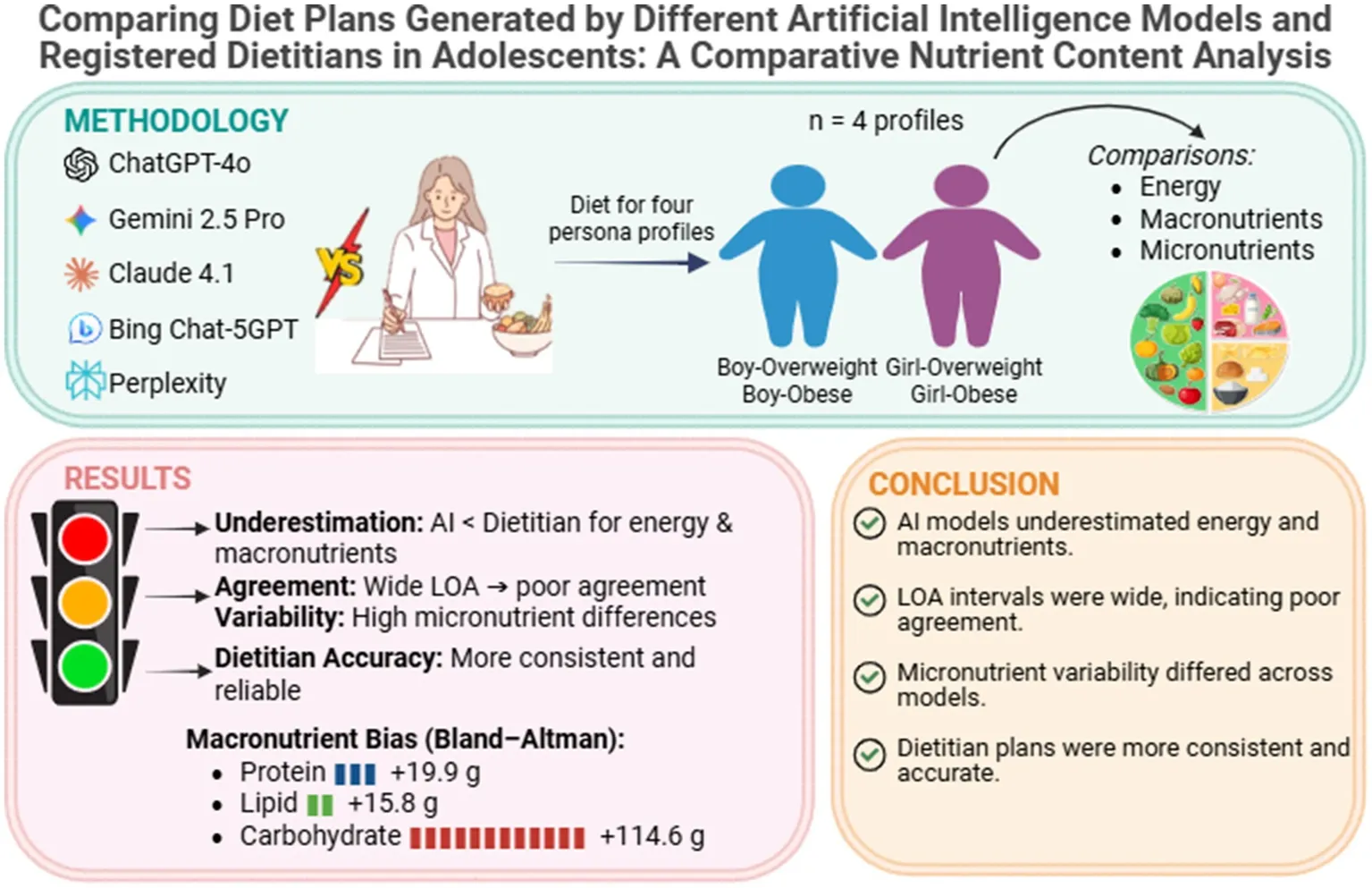 However, most of this evidence comes from adult populations and from hypothetical or scenario-based clinical cases. According to current systematic reviews and recent literature, there are no studies that directly compare diets generated by AI-based systems for overweight and obese adolescents with individualized medical nutrition therapy planned by a dietitian for the same individual, in terms of energy and nutrient content, safety and feasibility (12, 13, 17). In addition, only a small number of studies have examined how much diets produced by different chatbots (e.g., LLMs such as ChatGPT, Gemini and Microsoft Copilot) for the same clinical scenario diverge from one another and from a dietitian-planned diet. Existing findings indicate that there can be meaningful differences in energy and nutrient levels—and at times clinically important deviations—between the diets recommended by these models (15–17).