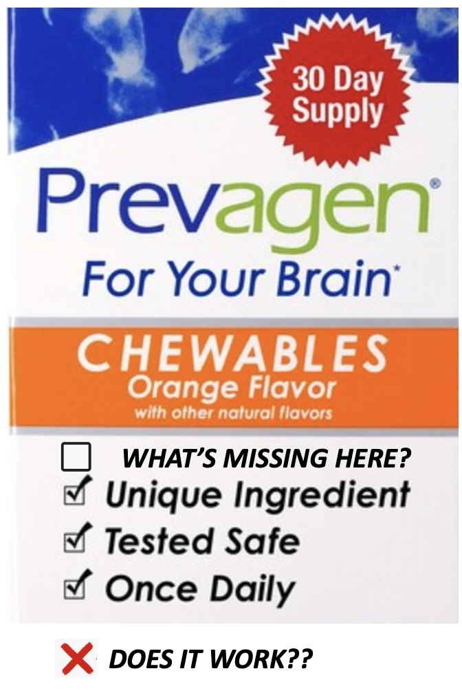 Let’s hear it for Prevagen. It’s safe! You only have to take it once a day! It has a unique ingredient! So does a plutonium bomb. Does it do anything useful? Careless omission?