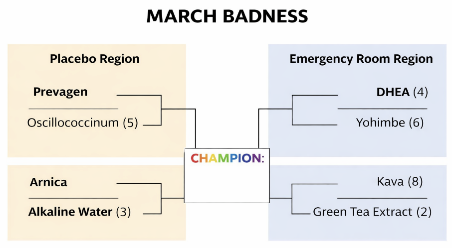 March Madness inspires millions of sports fans to fill out brackets and pretend they can predict the unpredictable. Inspired by this annual ritual, here’s a tournament of a different kind. Instead of basketball teams, the competitors are some of the most dubious dietary supplements on the market.