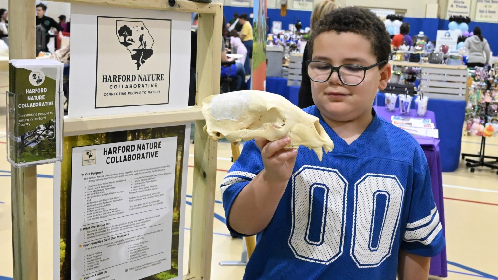 Eight-year-old Joseph Flateau of Abingdon inspects the skull of a black bear at a booth setup by Harford Nature Collaborative at the Spring Into Wellness Fair, organized by Macaroni Kid Bel Air, at Harford Day School on Saturday. (Brian Krista/Staff)