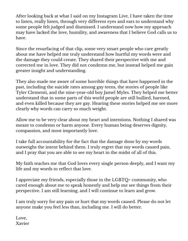 “After looking back at what I said on my Instagram Live, I have taken the time to listen, really listen, through very different eyes and ears to understand why some people felt judged and dismissed. I understand now how my approach may have lacked the love, humility, and awareness that I believe God calls us to have.