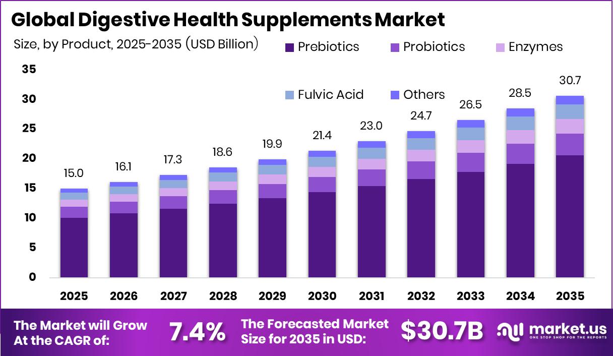 The Global Digestive Health Supplements Market is expected to be worth around USD 30.7 billion by 2034, up from USD 15.0 billion in 2024. It is projected to grow at a CAGR of 7.4% from 2025 to 2034.