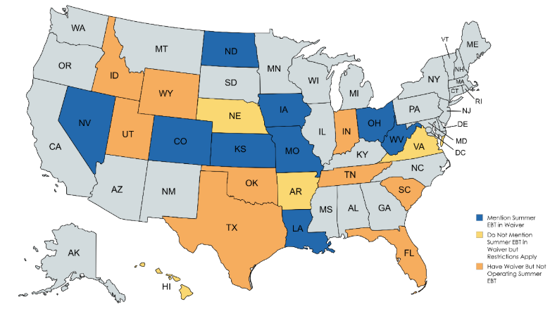 As their SNAP food choice restrictions go into effect, many states are applying the restriction rules to Summer EBT, meaning the SNAP waiver requirements also determine what families can buy with Summer EBT benefits. The map above illustrates which states are rolling Summer EBT into their SNAP waivers.