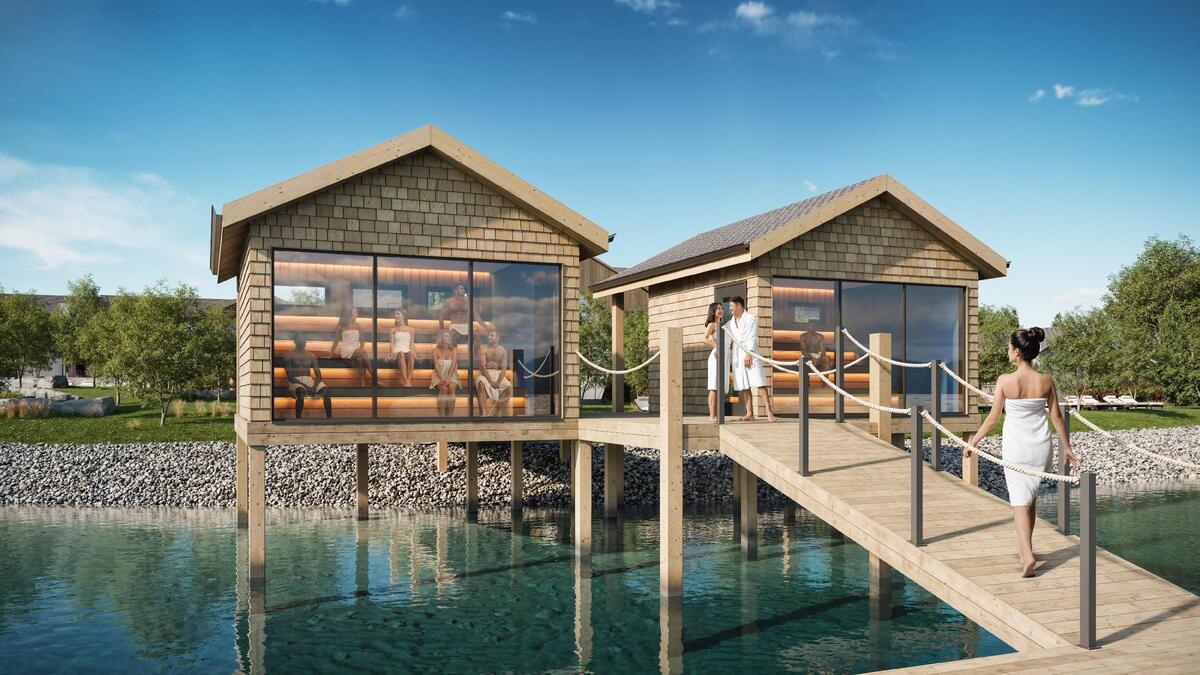The Nordic wellness experience at this destination spa hotel will have a thermal circuit featuring steamrooms, hot and cold pools, hydrotherapy facilities and curated wellness rituals. There will be various saunas, some of which will float on the lake, a salt flotation pool, lakefront relaxation zones, fire gardens and three docks to facilitate access to the water.