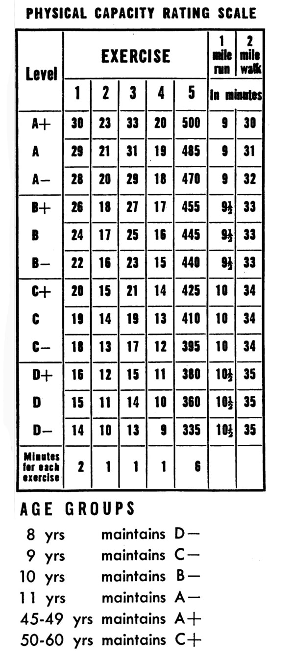 Each age group is given a Physical Capacity level to attain; that is, a goal which they should try to reach.