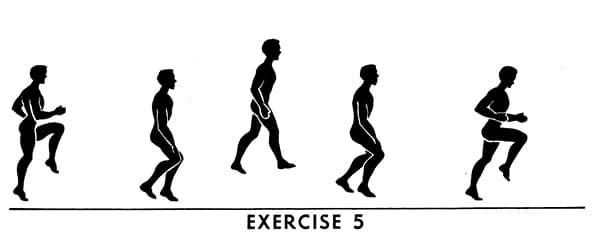 Semi-squat jumps. Drop to a half crouch position with hands on knees and arms straight, keep back as straight as possible, right foot slightly ahead of left. Jump to upright position with body straight and feet leaving floor. Reverse position of feet before landing. Return to half crouch position and repeat.
