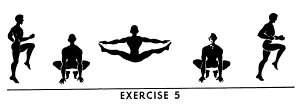 Jack jumps. Feet together, knees bent, sit on heels, finger tips touch floor. Jump up, raise legs waist high, keep legs straight and touch toes in midair. Keep legs straight, raise feet level to “standing waist height.” Touch toes each time.
