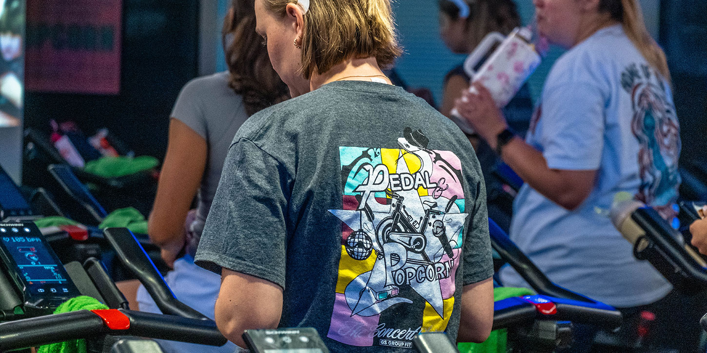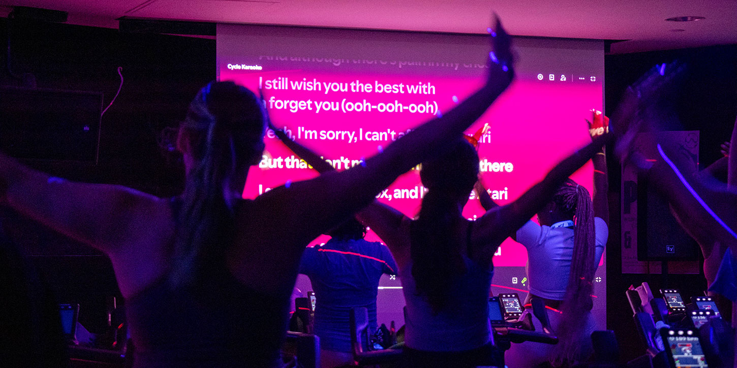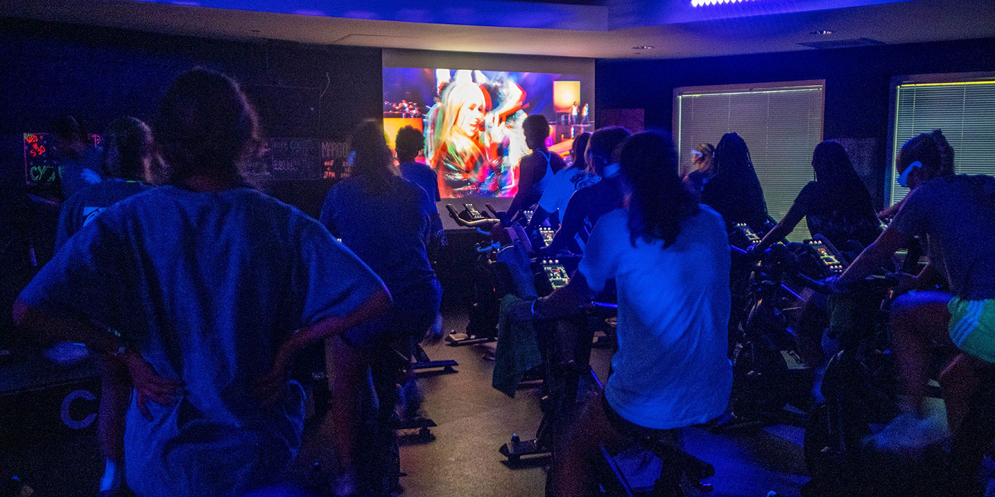 Beyond daily classes, the department has turned group formats into special events to keep students engaged and coming back. The Pedal and Popcorn series transforms a cycling class into a watch party with concerts projected on a large screen and has even evolved into a full themed series.