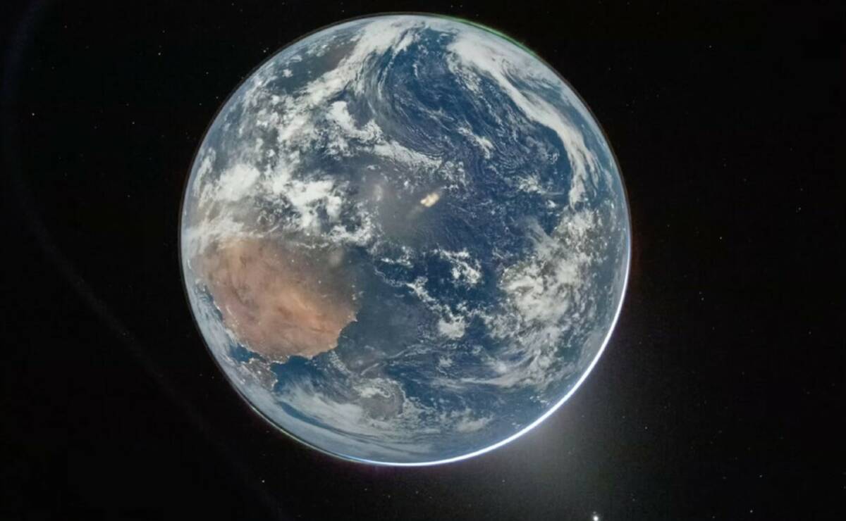 The first photo taken by commander Reid Wiseman shows a curved slice of Earth in one of the capsule’s windows. The second shows the entire globe with the oceans topped by swirling white tendrils of clouds. A green aurora even glows, according to NASA.
