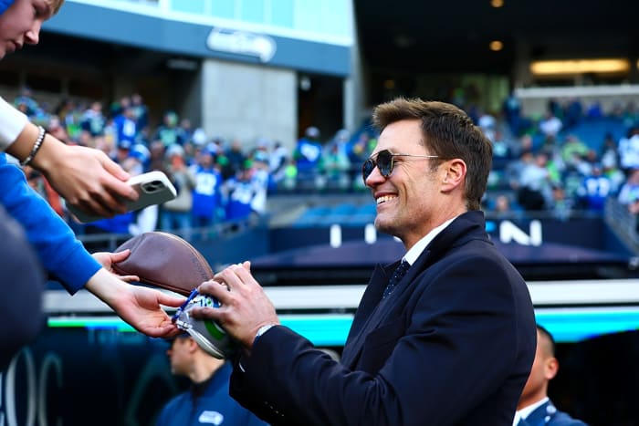 Jan 25, 2026; Seattle, WA, USA; Tom Brady signs autographs before the 2026 NFC Championship Game between the Seattle Seahawks and the Los Angeles Rams at Lumen Field. Mandatory Credit: Kevin Ng-Imagn Images