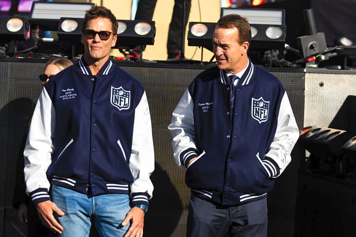 Feb 8, 2026; Santa Clara, CA, USA; Tom Brady (left) and Peyton Manning before Super Bowl LX between the Seattle Seahawks and the New England Patriots at Levi’s Stadium. Mandatory Credit: Mark J. Rebilas-Imagn Images