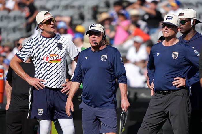 Mar 21, 2026; Los Angeles, CA, USA; Founders FFC quarterback Tom Brady (left) and coaches Sean Payton (center) and Jim Harbaugh react during the Fanatics Flag Football Classic at BMO stadium. Mandatory Credit: Kirby Lee-Imagn Images
