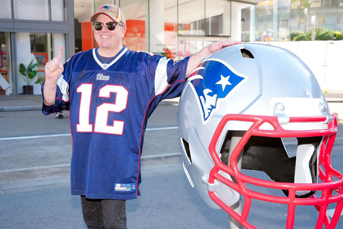 Feb 4, 2026; San Francisco, CA, USA; A New England Patriots fan wearing a No. 12 Tom Brady jersey poses with large helmet at the Super Bowl LX Experience at the Moscone Center. Mandatory Credit: Kirby Lee-Imagn Images
