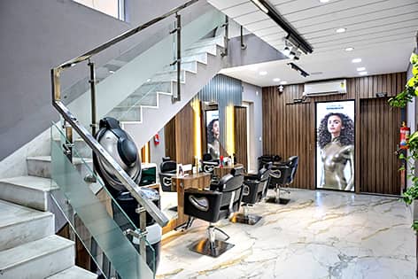 The ground floor welcomes you to a chic nail art zone. Climb a floor higher, and a familiar energy of a modern salon greets you. Haircuts in progress, quiet consultations, the occasional whirr of a dryer.