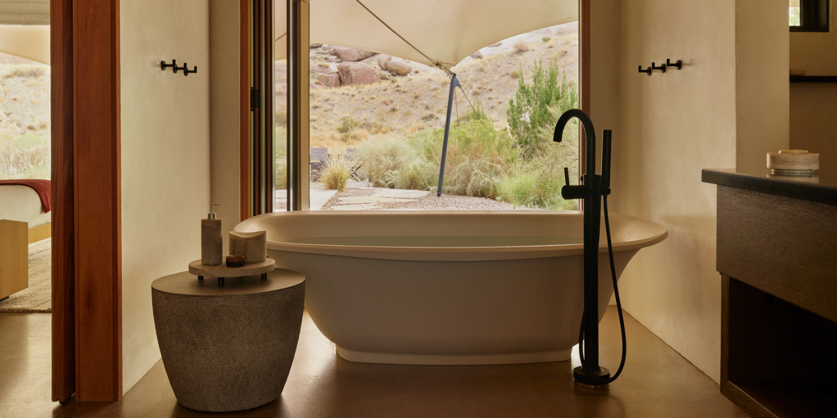 The 34 suites are arranged in two wings sweeping from the central Pavillion, each with private terraces, fireplaces, and courtyard entrances, and every interior element was custom-designed. The 25,000-square-foot Aman Spa is spread across five separate pavilions scattered like tumbled rocks, and a short distance away, Camp Sarika offers ten tented pavilions, each with a private plunge pool, for those who want to push even further into the back country. The experience programming includes ferrata climbing, horseback rides across the open desert, helicopter tours over Lake Powell, slot canyon treks, and more.