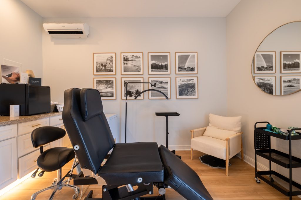 Designed to feel like a serene, coastal retreat, the space blends clean architectural lines with natural light, warm wood tones and soft neutral textures. Floor-to-ceiling windows and sunlit corridors bring Maui’s tropical surroundings in, while minimalist décor and curated artwork create a calm, refined environment. Treatment rooms are intentionally simple and peaceful, while the IV lounge offers a relaxed, social wellness experience with comfortable recliners and soft ambient lighting.