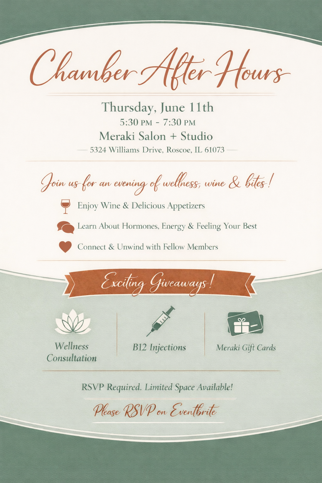 Holistic Wellness 4U, a local functional medicine and hormone optimization practice, is hosting a Chamber After Hours event on Thursday, June 11th from 5:30–7:30 PM at Meraki Salon + Studio in Roscoe.