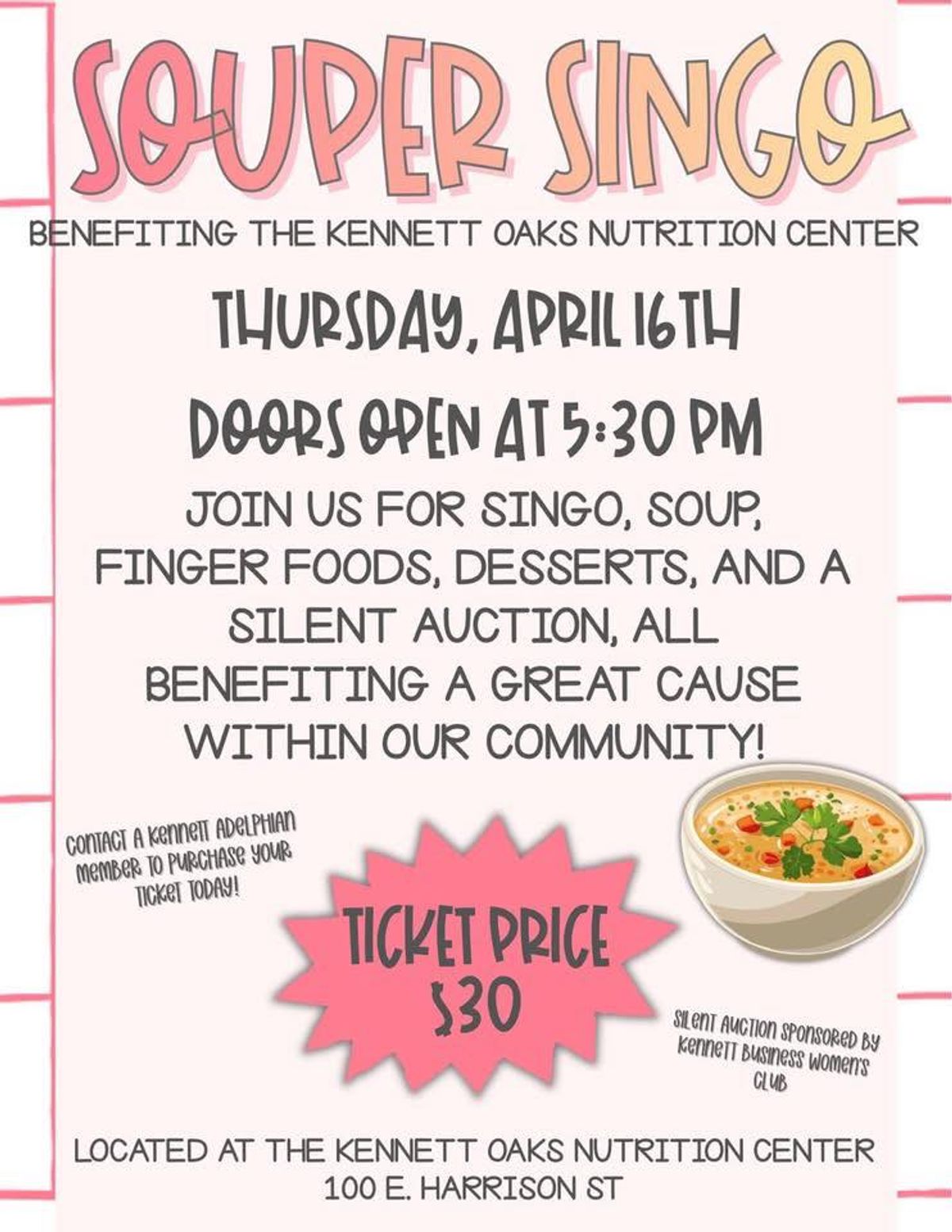 The evening is expected to include soup, finger foods, dessert, and a silent auction, as well as, rounds of SINGO, a game that pairs songs with bingo-style cards, with organizers encouraging residents to “come join us for an evening full of delicious food, fun SINGO games, lots of laughs and great company.”
