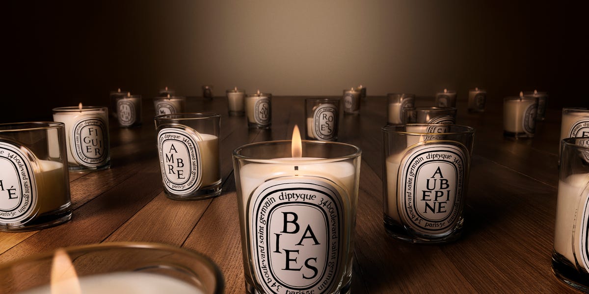 Collection of scented candles on a wooden table.Courtesy of Diptyque