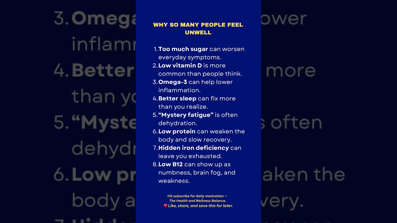 This video presents eight common reasons why people feel unwell, including excessive sugar intake and low vitamin D levels. Discover crucial nutrition tips for better well-being, emphasizing the importance of adequate vitamin B12 and iron. Understanding these factors can help combat low energy and promote public health. Subscribe for daily motivation from The Health and Wellness Balance! 💪