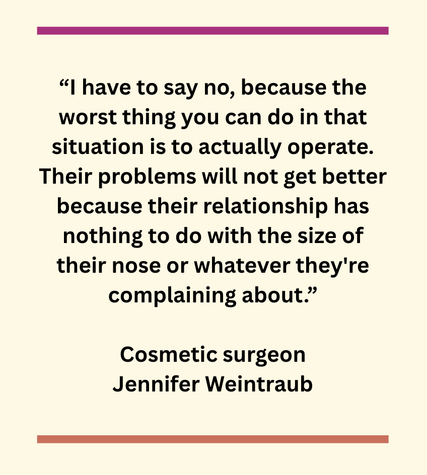 “It’s not really the physical part that they’re complaining about,” Weintraub said. “That’s the problem. I try to validate someone for how they feel because they really do feel that way, but I have to say no, because the worst thing you can do in that situation is to actually operate. Their problems will not get better because their relationship has nothing to do with the size of their nose or whatever they’re complaining about. They’re mad at you — really mad at you — for about 10 minutes, but it’s better than them being mad at you for the rest of their lives.”