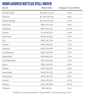 Amidst these crosswinds, the category is relatively stable. Market research firm Circana reported that sales of the $17.6 billion unflavored, bottled still water category in U.S. MULO and c-store accounts were down by 0.6% in the 52-week period ending December 28, 2025. However, in a sign that stocking up is beating out single-serve purchasing, bulk still water products were up 3.2% in the same period to $2.7 billion.