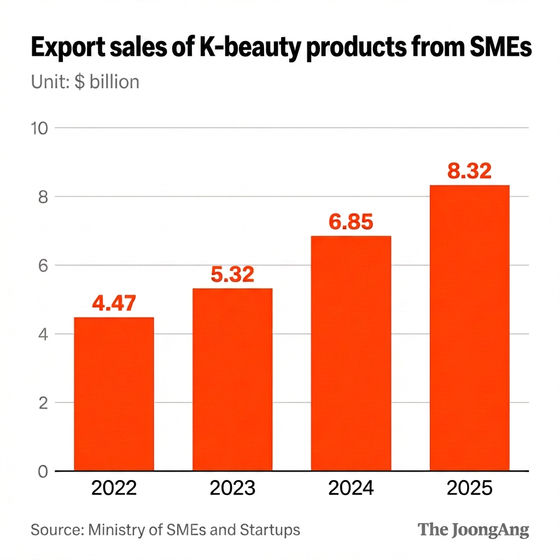Yearly cosmetic exports by Korean SMEs came to $8.32 billion last year, nearly double the $4.47 billion posted in 2022, according to the Ministry of SMEs and Startups on Wednesday. SMEs also gained ground in total beauty product exports, rising from 56.2 percent in 2022 to 72.8 percent last year.