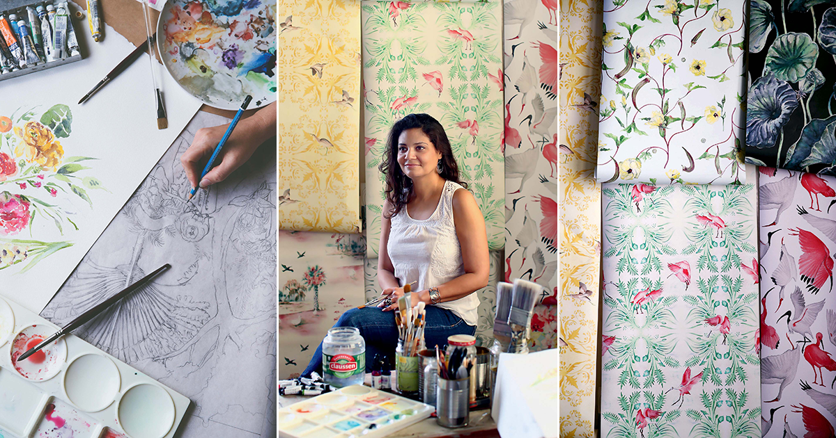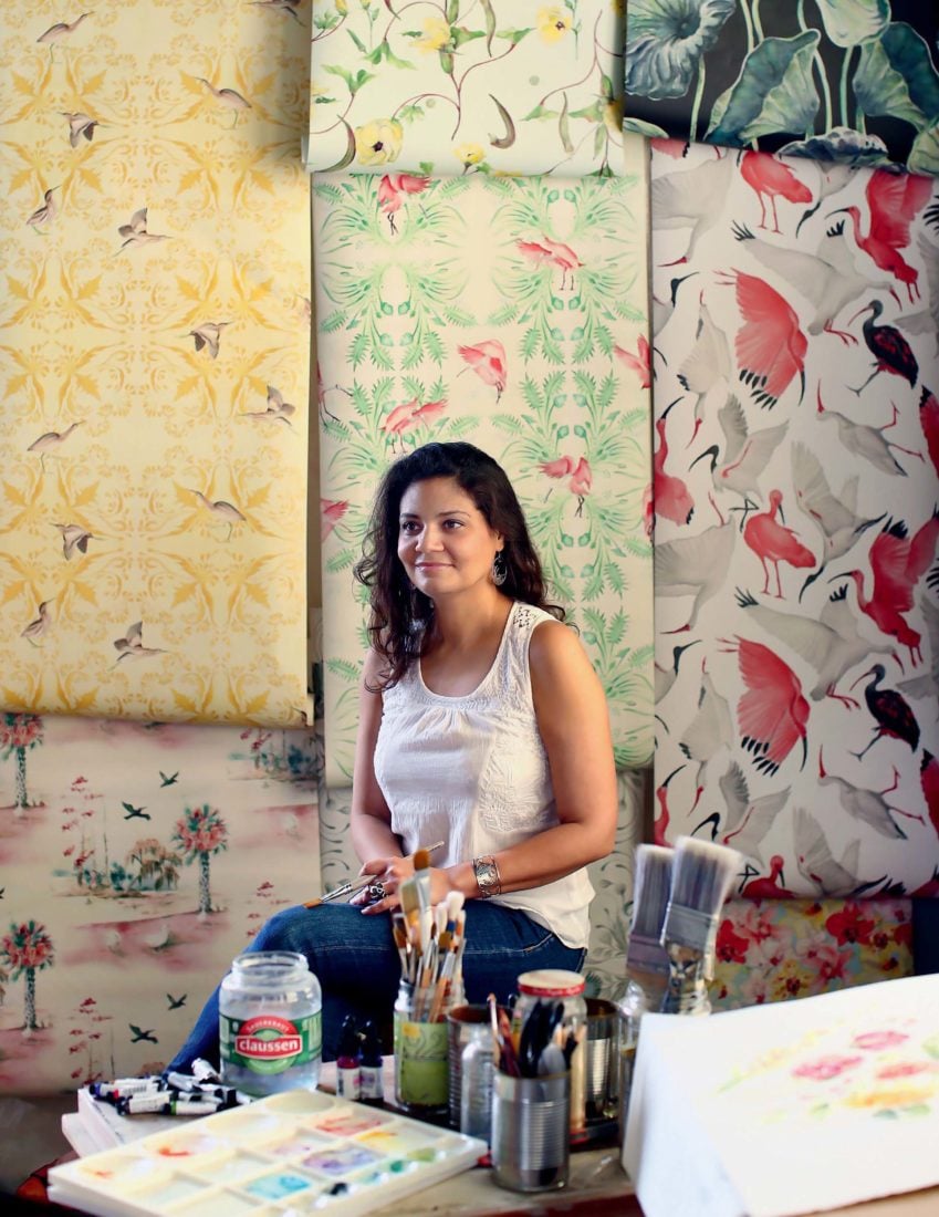 Inside the Gentilly studio of the artist and designer Annie Moran, okra flowers twine up a clear blue sky. Nearby, lotus leaves unfurl, damp against dark water, while roseate spoonbills fluff their pencil-sketched feathers. A Zulu masker blows his whistle under a crown of plumes. New Orleans is as lush and alive on the wallpapers, textiles, prints, and murals Moran creates as it is on the streets and bayous beyond her doors.