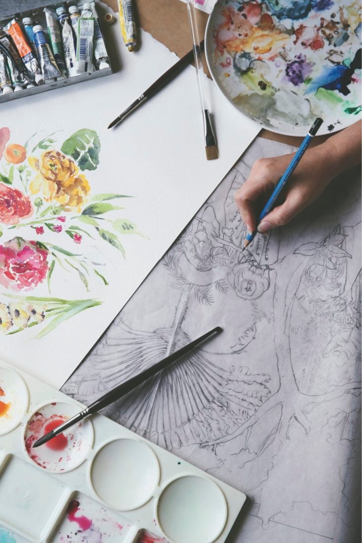 Moran draws a preliminary design for an upcoming mural project.