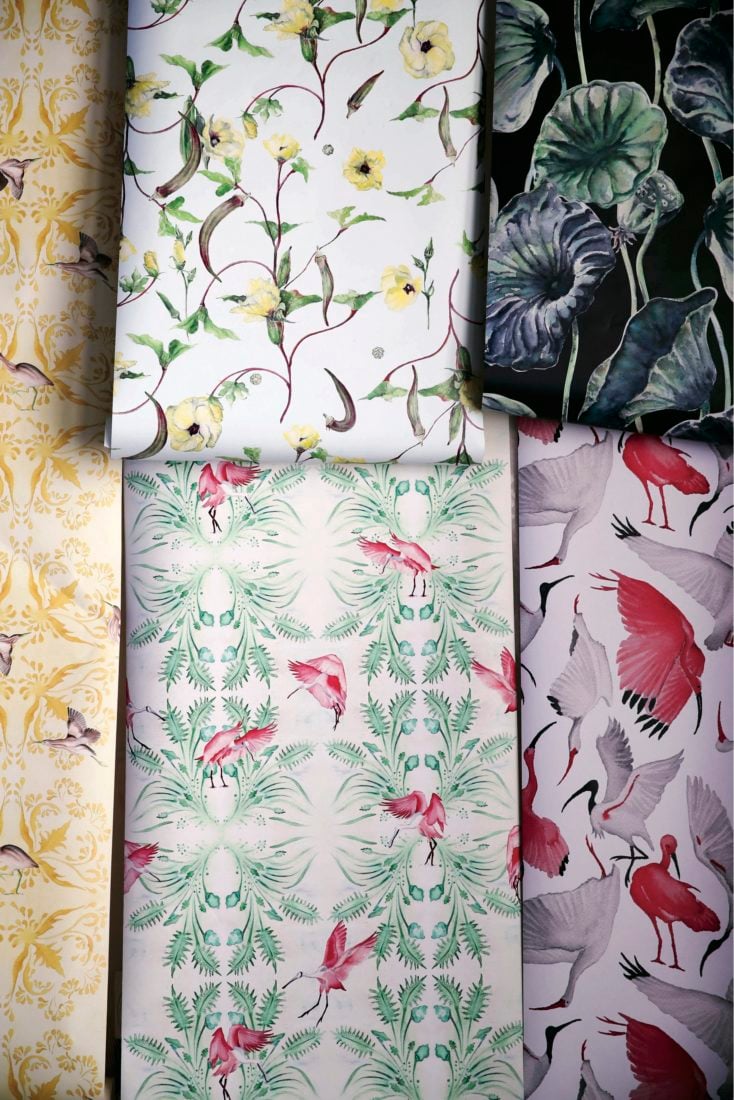 Moran wallpaper patterns feature least bitterns, blooming okra, lotus leaves, scarlet and white ibis, and roseate spoonbills.