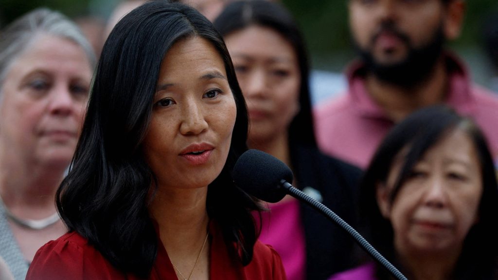 Boston Mayor Michelle Wu responds to a letter from U.S. Attorney General Pam Bondi demanding that Boston lift its sanctuary city policies, at a press conference in Boston, Massachusetts, U.S., August 19, 2025. A sanctuary city is a jurisdiction that has laws and policies that limit or prevent local law enforcement from assisting federal officers with civil immigration arrests. REUTERS/Brian Snyder
