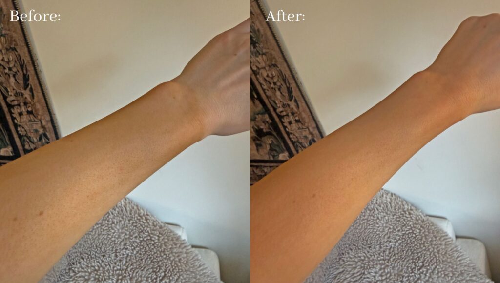 Before using Sally Hansen Airbrush Lotion, I had a very uneven and streaky spray tan—particularly at my wrist. After applying the product, it totally evened it out and blended everything in. (Using shade Light.)