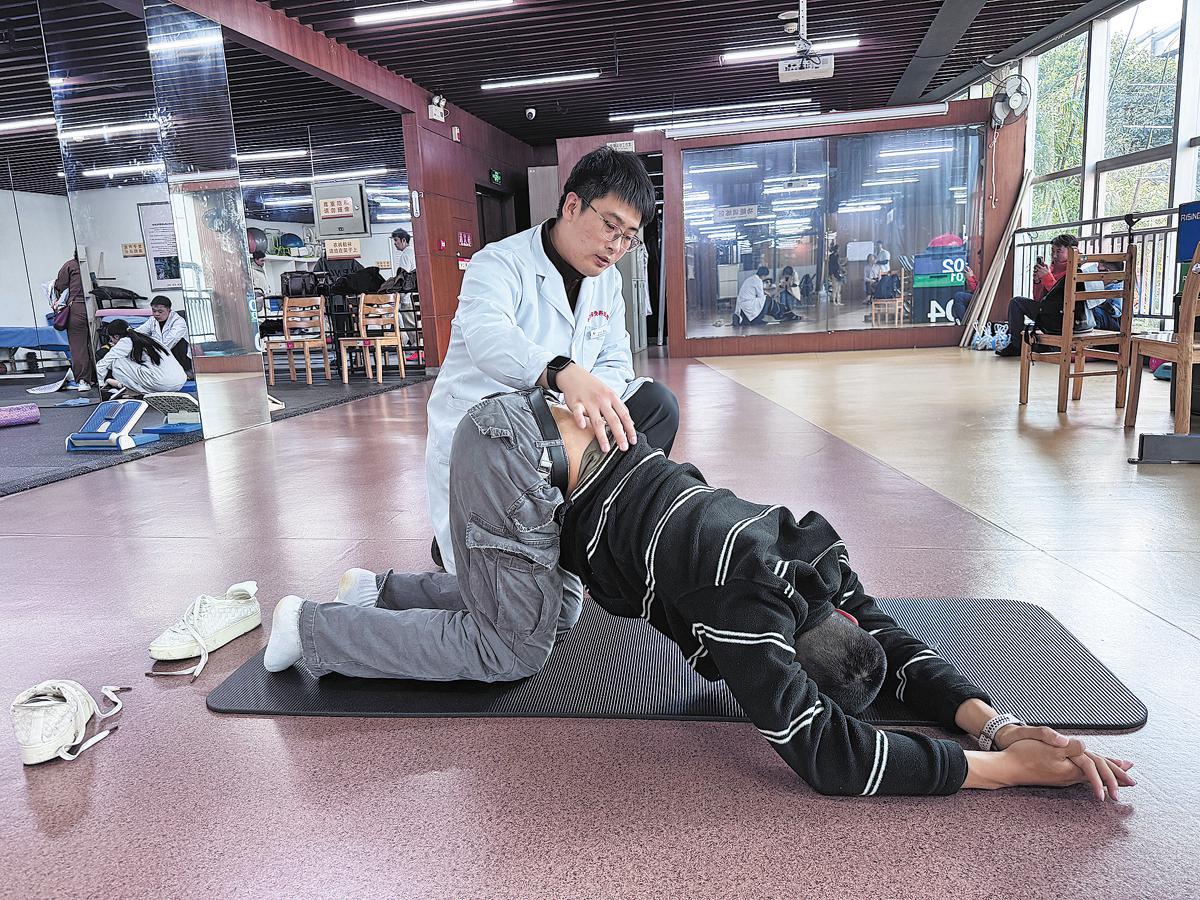 Therapist Yuan Zheng guides a patient through an exercise at Sichuan Province Orthopedic Hospital in Chengdu, Sichuan province, last month. WANG TUO/FOR CHINA DAILY