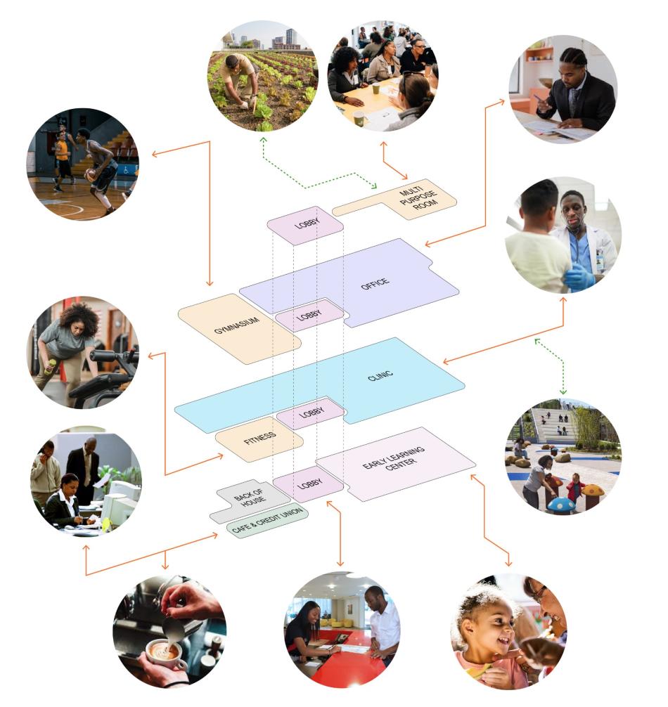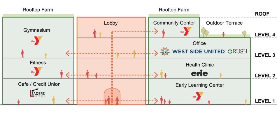 The facility includes a clinic, fitness center, and office space for nonprofits and minority-owned businesses in addition to housing anchor tenants including the Garfield Park Rite to Wellness Collaborative, Rush University Medical Center, West Side United, Equal Hope, and the YMCA of Metropolitan Chicago.